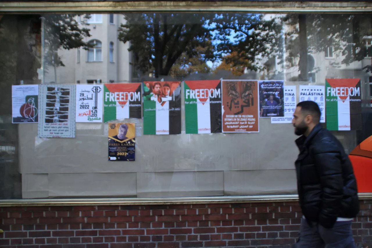 “Ci sono più attività culturali arabe a Berlino che in qualsiasi città del mondo arabo”, dice Mohamed. Lui stesso espone in un piccolo spazio lungo la Sonnenallee, un tempo passaggio di confine tra Berlino Est e Berlino Ovest, soprannominata “Arabische Straße”, ossia la “strada araba”. Non c’è negozio, caffè, ristorante o manifesto che non ricordi i nomi e i volti dei prigionieri politici palestinesi in Israele o lo sciopero della fame di Alaa Abdel Fattah. Qui tutto rimanda a Damasco, Gerusalemme, Baghdad o al Cairo. Lunga 5 chilometri, la Sonnenallee attraversa la parte sud del quartiere di Neükolln, che storicamente ospita l’immigrazione siriano-libanese, ma anche l’immigrazione palestinese. La loro presenza risale alla seconda metà degli anni 1970, dopo l’inizio della guerra civile in Libano, favorita dagli stretti rapporti tra sinistra palestinese ed estrema sinistra tedesca. L’azione più eclatante fu l’Operazione Entebbe2, quando, nel giugno 1976, il Fronte Popolare per la Liberazione della Palestina (FPLP) e le Revolutionäre Zellen3 (RZ) dirottarono un aereo della Air France, proveniente da Tel Aviv, decollato dall’aeroporto di Atene e diretto a Parigi.