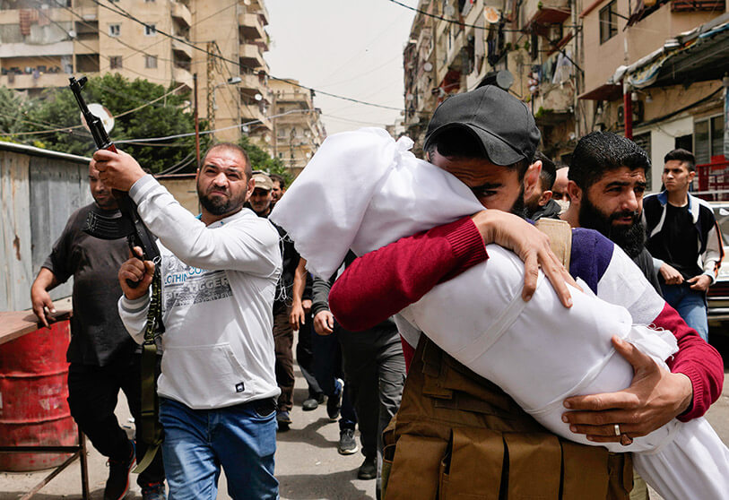 AP/HASSAN AMMAR – Un uomo trasporta il corpo di una bambina, mentre un altro spara in aria durante il corteo funebre per sette persone uccise da un’imbarcazione piena di migranti affondata nel fine settimana mentre la marina libanese cercava di riportarla a riva, a Tripoli, nel nord del Libano, lunedì 25 aprile 2022.