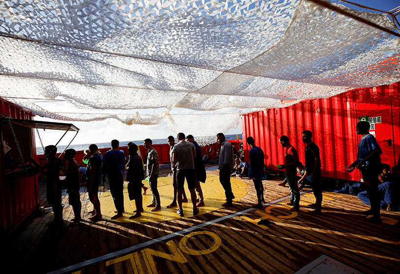 REUTERS/JUAN MEDINA – Migranti in fila per la colazione durante il sesto giorno di attesa di un porto sicuro per sbarcare a bordo della nave di soccorso della ONG Proactiva Open Arms One nel mezzo del Mar Mediterraneo, 22 agosto 2022