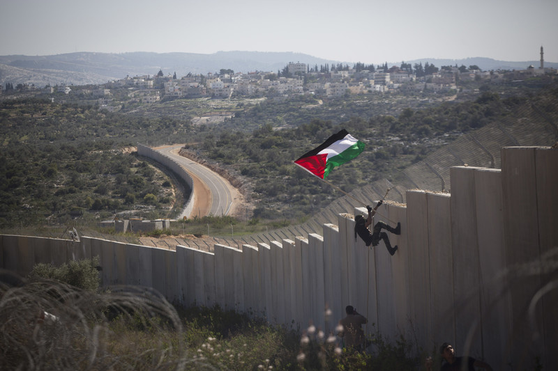 Un giovane palestinese mette una bandiera sul muro di Israele durante una manifestazione nel villaggio cisgiordano di Bilin nel febbraio 2014. Oren ZivActiveStills