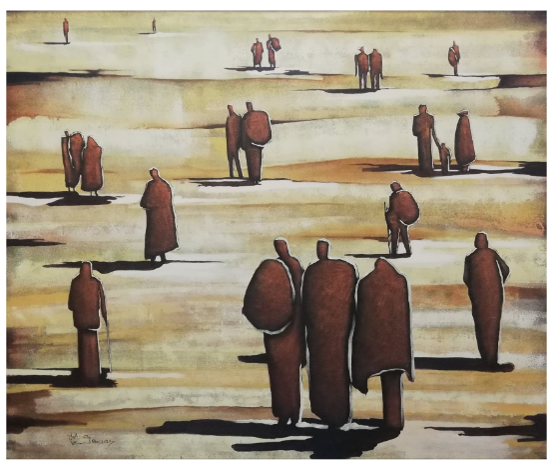 Ispirato dai racconti del padre sul processo ancora in corso della Nakba e dall’esperienza di spostamento che lui stesso ha vissuto tra Gaza e Libia, come i tanti palestinesi in diaspora, l’artista si concentra sulla relazione tra il territorio e il dislocamento creando immagini in cui “L’ombra umana diventa l’orizzonte che porta con sé ricordi del passato e aspirazioni per il futuro”. Nelle sue opere il cambiamento dello spazio generato da spostamenti forzati diventa quasi metafisico esprimendo la consapevolezza che la dispersione, l’emigrazione forzata, la diaspora sono percorsi che accomunano i palestinesi ad altri popoli arabi i cui paesi sono devastati dalle guerre.  Con questa cognizione nel 2019 realizza una serie di quadri che intitola “Displacement” e con cui parteciperà nel 2021 alla mostra “Transizioni” tenutasi a Gaza. Di questa collezione fa parte il quadro “Immigration” (tela 2) con cui partecipa alla Biennale 2022 e insieme a due sculture dedicate al ruolo delle donne palestinesi nella Grande Marcia del Ritorno.