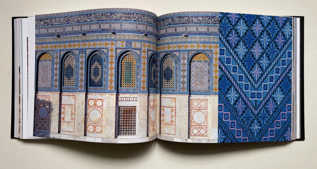 Dopo aver sfogliato più di due terzi del libro, sento quell’elevazione dell’anima soprattutto dalle foto delle donne palestinesi che lavorano tradizionalmente a ricamo, accanto alle foto dell’arabesco della Cupola della roccia – le linee quasi convergono. Sabella continua questa linea di pensiero: “Volevo invitare o condurre il pubblico in un viaggio attraverso la Palestina che sfidasse e rivedesse le loro aspettative, creando connessioni accattivanti”.