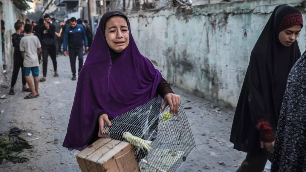 Una ragazza che trasporta una gabbia per uccelli pinage mentre la gente fugge in seguito a un attacco israeliano a Rafah, nel sud della Striscia di Gaza, il 23 novembre (AFP)