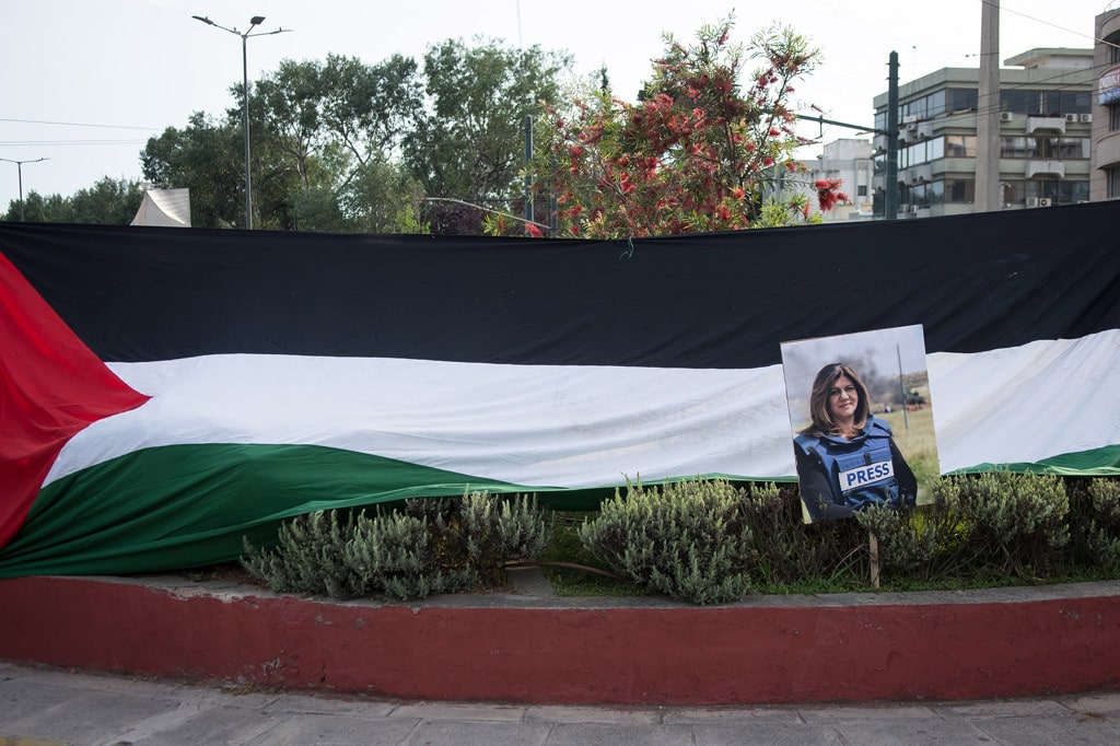 Atene, Grecia, 16 maggio 2022. Una commemorazione per Shireen Abu Akleh davanti all’ambasciata israeliana. (Nikolas Kokovlis, NurPhoto/Getty Images)