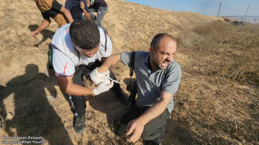 Il lavoro di monitoraggio e documentazione portato avanti dal Centro Al Mezan per i Diritti Umani indica che le forze di occupazione israeliane di stanza presso il muro di separazione orientale nell’area di Abu Safiya, a est della città di Jabalia nel Governatorato di Gaza Nord, hanno aperto il fuoco con varie armi, alle 16:30 di domenica 17 settembre, verso un raduno di cittadini vicino al muro di separazione per protestare contro gli attacchi estremisti alla moschea di Al-Aqsa, e i gas lacrimogeni sono stati usati come arma, sparando direttamente contro i corpi dei cittadini, e in particolare dei giornalisti, che erano presenti per seguire la manifestazione, che ha provocato il ferimento del fotografo della compagnia Al-Manara, Fadi Mahmoud Ramadan Al-Danaf (36 anni), con una bomba a gas nel ginocchio ginocchio e del fotografo dell’Agenzia di stampa francese (AFP), Bilal Bassam Odeh Al-Sabagh (32 anni), con una bomboletta di gas lacrimogeno sulla coscia destra, e del fotografo dell’Agenzia Anadolu, Mustafa Muhammad Al-Badri Hassouna (42 anni), in faccia.