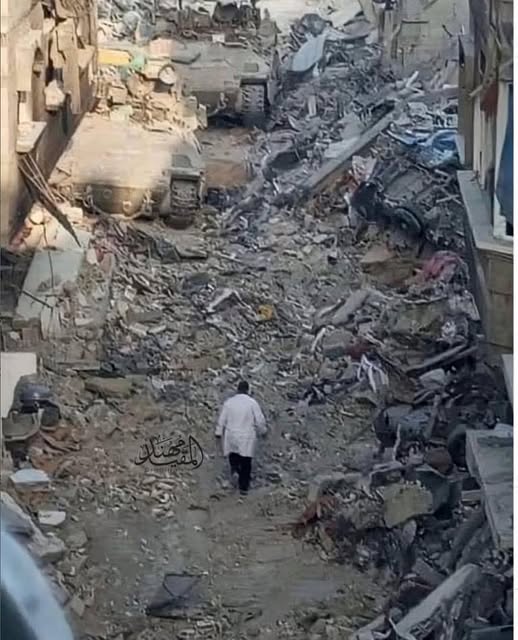 Questa immagine, scattata negli ultimi giorni dell’anno, raccontava tutto. Mostrava un medico solitario — che aveva rischiato la vita per mantenere operativo il suo ospedale nonostante l’assedio delle forze israeliane, i bombardamenti di artiglieria e droni israeliani, e il sistematico abbattimento del personale da parte dei cecchini israeliani — avanzare coraggiosamente verso i suoi carnefici e quelli del suo popolo.