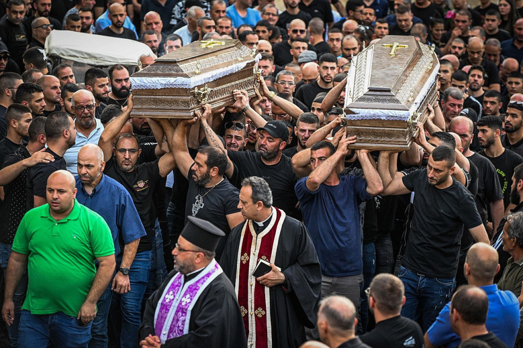 I fedeli portano le bare di due dei cinque uomini uccisi la settimana scorsa nel villaggio palestinese di Yafa an-Naseriyye, nel nord di Israele, 9 giugno 2023. (Flash90)