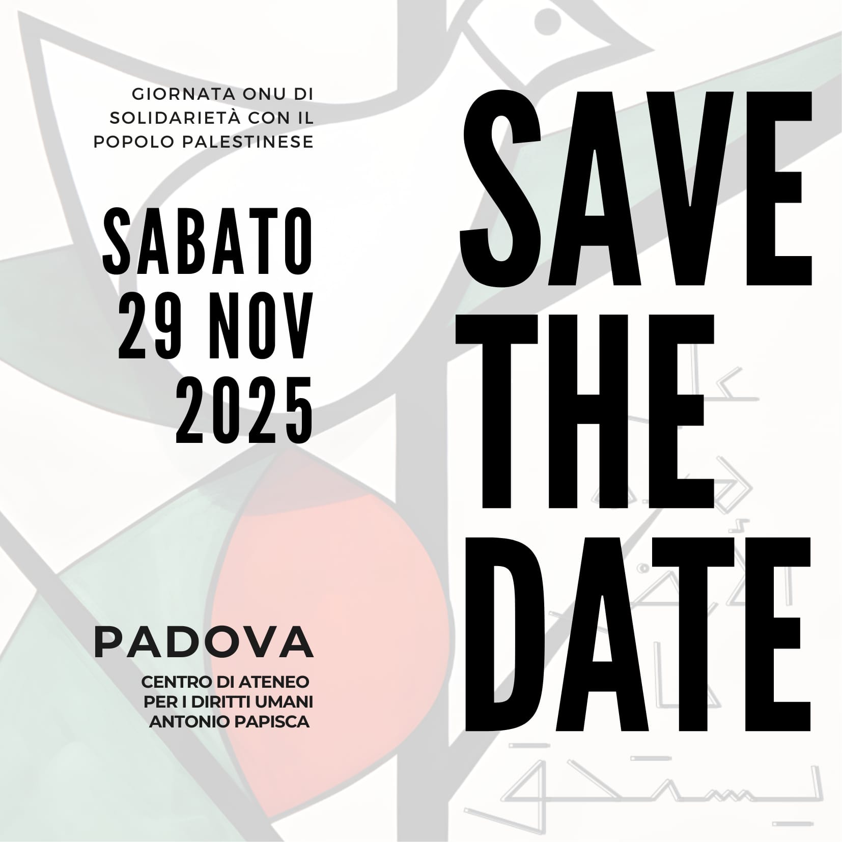 Nel 1977, l’Assemblea Generale delle Nazioni Unite dichiarava il 29 novembre Giornata internazionale della solidarietà con il popolo palestinese (Risoluzione 32/40B). Quest’anno la 47° Giornata ONU sarà organizzata a Padova presso il Centro Ateneo Diritti Umani di Padova sabato 29 novembre 2025. La Giornata è promossa dalla Campagna Ponti e non Muri di Pax Christi Italia e dal Centro di Ateneo per i Diritti Umani “Antonio Papisca”. Aderisce la rete padovana Uniti per la pace.