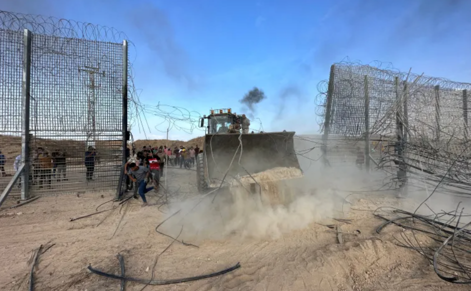 Un bulldozer rompe la recinzione costruita da Israele intorno a Gaza il 7 ottobre 2023 [Reuters/Mohammed Fayq Abu Mostafa].