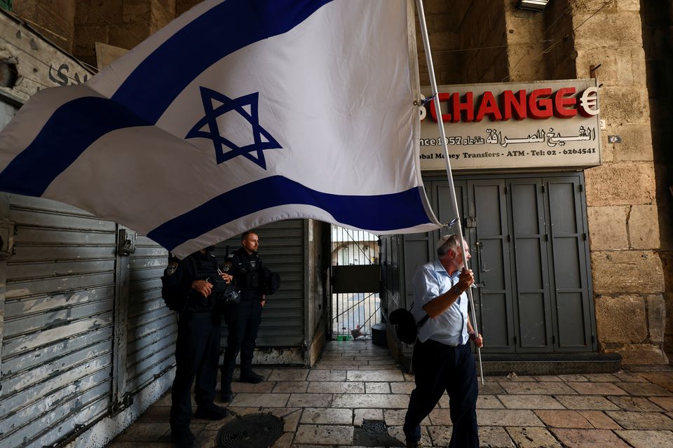 Un israeliano sventola una bandiera gigante mentre entra nella Porta di Damasco della città vecchia di Gerusalemme il 29 maggio 2022. REUTERS/ Ronen Zvulun