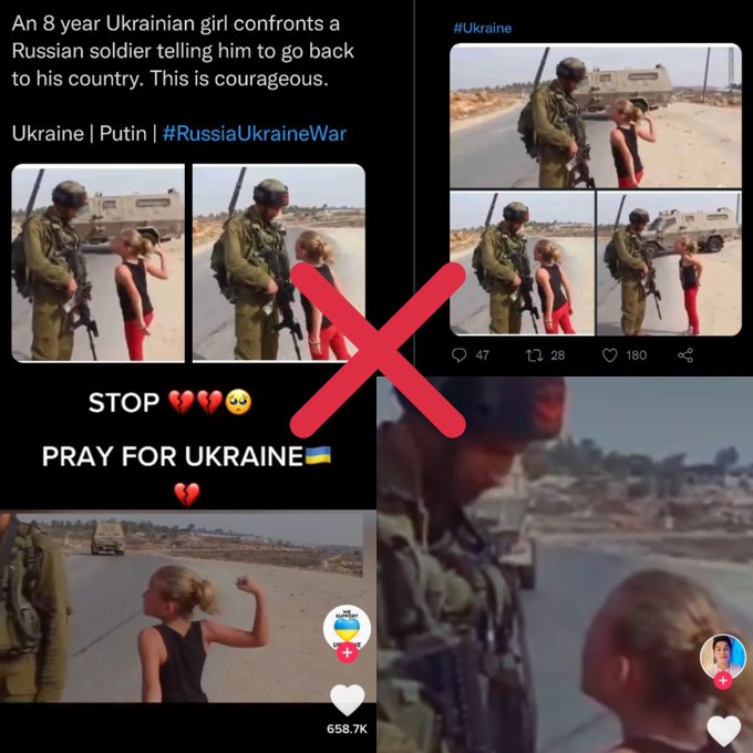 Un vecchio video di Ahed Tamimi, attivista palestinese arrestata nel 2017 da Israele, è stato ampiamente diffuso in rete con la falsa affermazione che fosse una ragazzina ucraina che teneva testa a un soldato russo.