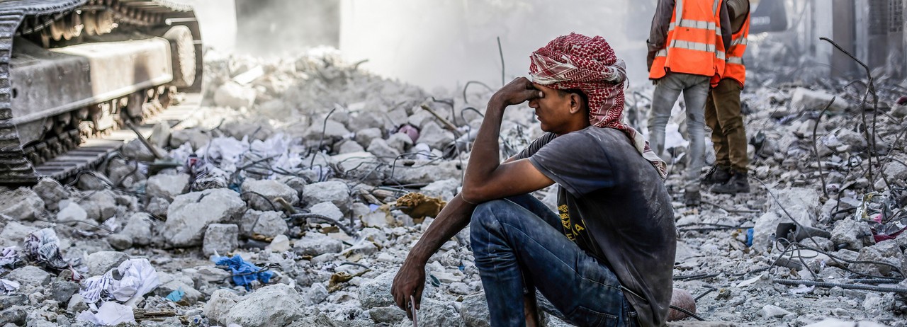 Un palestinese siede sulle macerie di una casa distrutta nella Striscia di Gaza dopo 11 giorni di violenze nel maggio 2021. (Foto: Mahmoud Issa/SOPA Images/LightRocket via Getty Images)