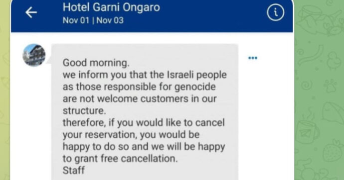 “Vi informiamo che le persone Israeliane in quanto responsabili di genocidio non sono clienti ben accetti nella nostra struttura. Quindi se voleste cancellare la vostra prenotazione sarete felici di farlo e noi saremmo felici di accordarvi gratuitamente la cancellazione”. Con queste parole lo “staff” di una struttura ricettiva di Selva di Cadore (Belluno), l’Hotel Garni Ongaro, ha risposto su Booking.com a un gruppo di turisti israeliani. Contattata, la struttura non ha voluto dare spiegazioni né dichiarazioni.