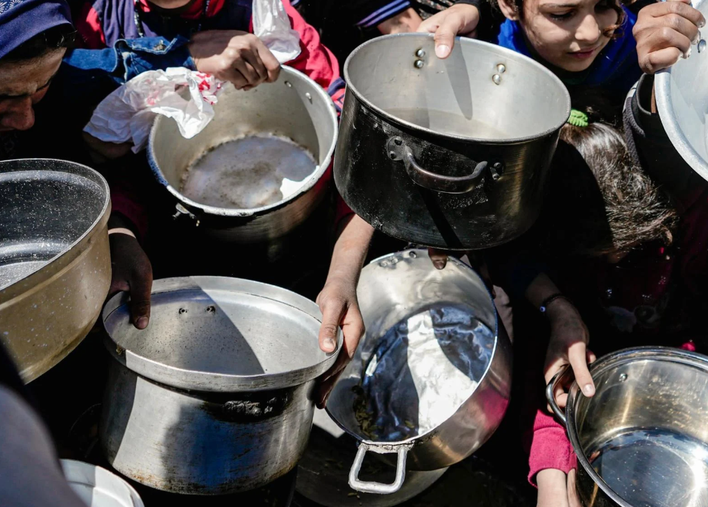 Foto di copertina: Bambini con i loro vasi vuoti in una mensa comunitaria nel nord di Gaza, Palestina, febbraio 2025. Nour Alsaqqa/MSF