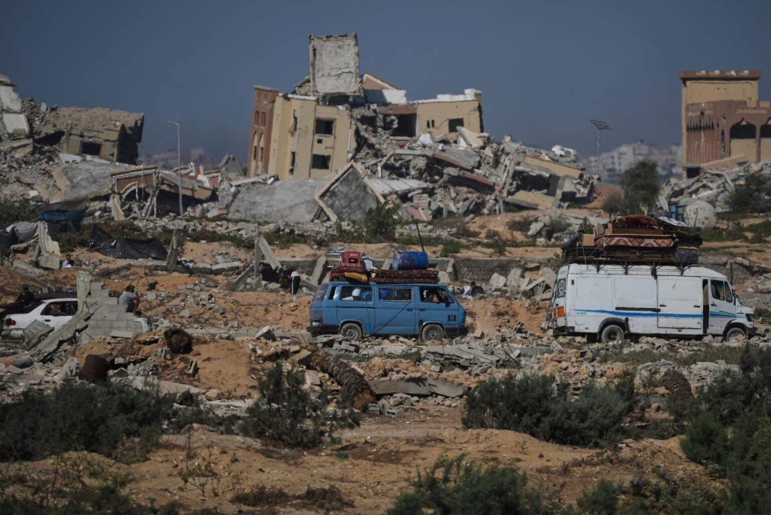Detriti di cemento costellano la strada dell’evacuazione. L’ONU stima che oltre il 90% degli edifici residenziali di Gaza siano stati danneggiati o distrutti dai bombardamenti israeliani. Abdel Kareem Hana/AP