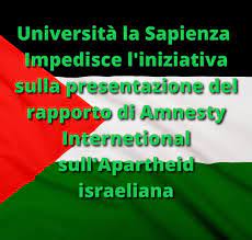 Il 22 marzo la Facoltà di Lettere e Filosofia avrebbe dovuto ospitare la presentazione del rapporto di Amnesty International, pubblicato il 1° febbraio, sul crimine di apartheid commesso da Israele nei confronti della popolazione palestinese. A poche ore dall’evento, tuttavia, la concessione dello spazio autorizzato sette giorni prima è stata ritirata.