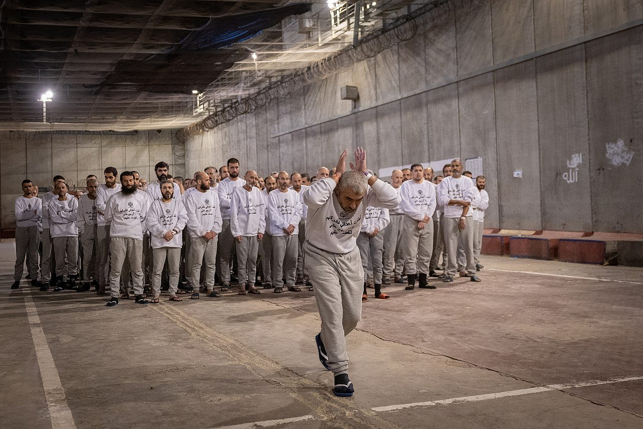 Funzionari del servizio penitenziario israeliano preparano i prigionieri palestinesi al rilascio nell’ambito di un accordo sugli ostaggi tra Israele e Hamas, nella prigione di Kteziot, nel sud di Israele, il 26 febbraio 2025. (Chaim Goldberg/Flash90)