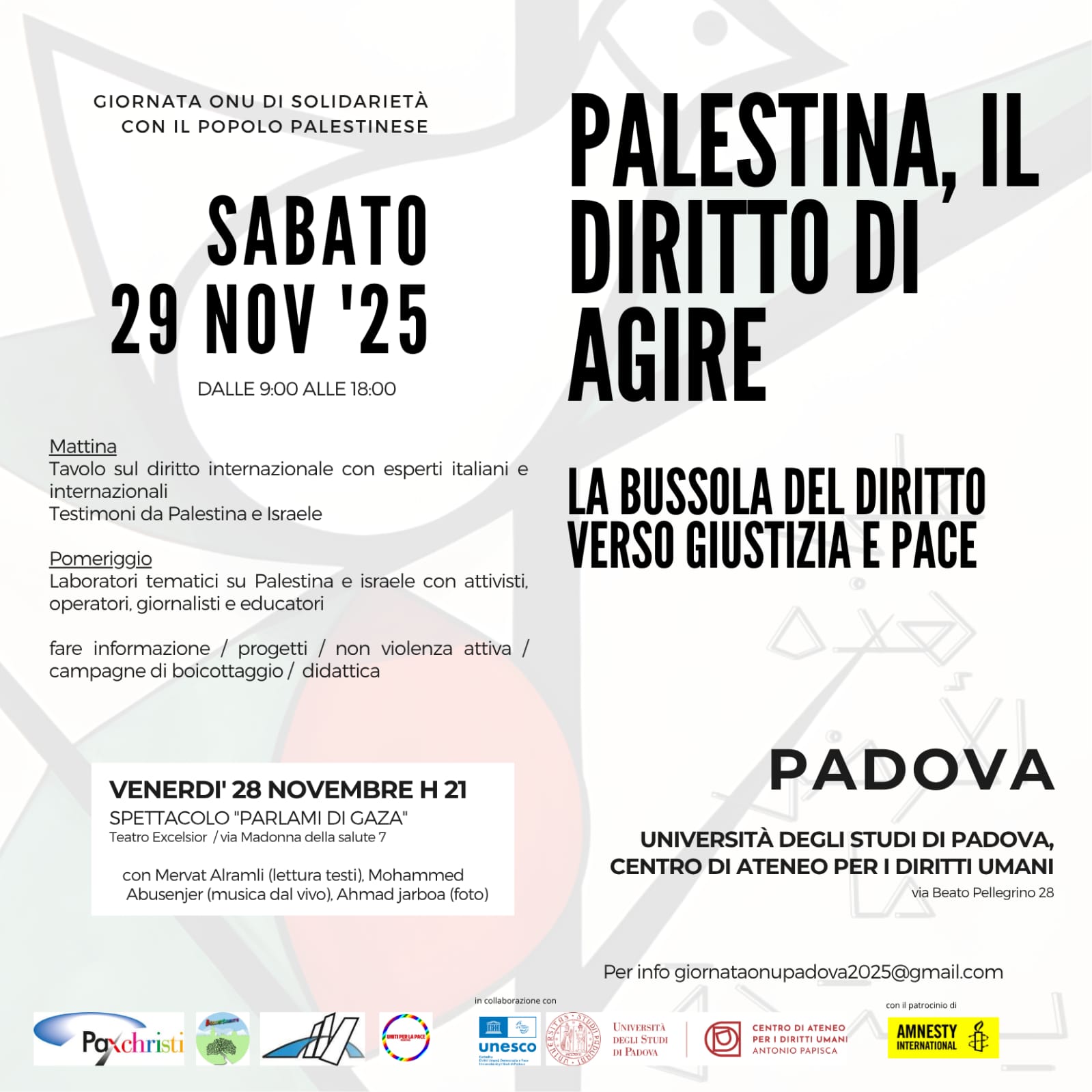 Nel 1977, l’Assemblea Generale delle Nazioni Unite dichiarava il 29 novembre Giornata internazionale della solidarietà con il popolo palestinese (Risoluzione 32/40B). Quest’anno la 47° Giornata ONU sarà organizzata a Padova presso il Centro Ateneo Diritti Umani di Padova sabato 29 novembre 2025. La Giornata è promossa dalla Campagna Ponti e non Muri di Pax Christi Italia e dal Centro di Ateneo per i Diritti Umani “Antonio Papisca”. Aderisce la rete padovana Uniti per la pace.