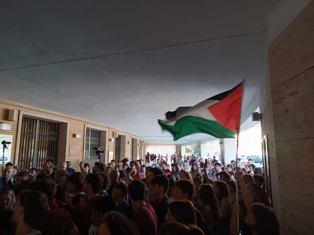 “Nessuna condanna assolve Israele, Sapienza stands with Gaza”, è lo striscione comparso martedi mattina all’università La Sapienza di Roma. “Abbiamo saputo lunedì sera tramite una mail istituzionale che oggi si sarebbe riunito il Senato Accademico per fare una mozione di condanna del brutale attacco contro Israele. Noi come studenti e studentesse abbiamo pensato che fosse assurdo che la Sapienza prendesse una posizione del genere mentre venivano bombardate tre università di Gaza, e tutta la striscia”, racconta Federico del collettivo Zauma, uno dei collettivi universitari che hanno aderito alla mobilitazione di ieri mattina.