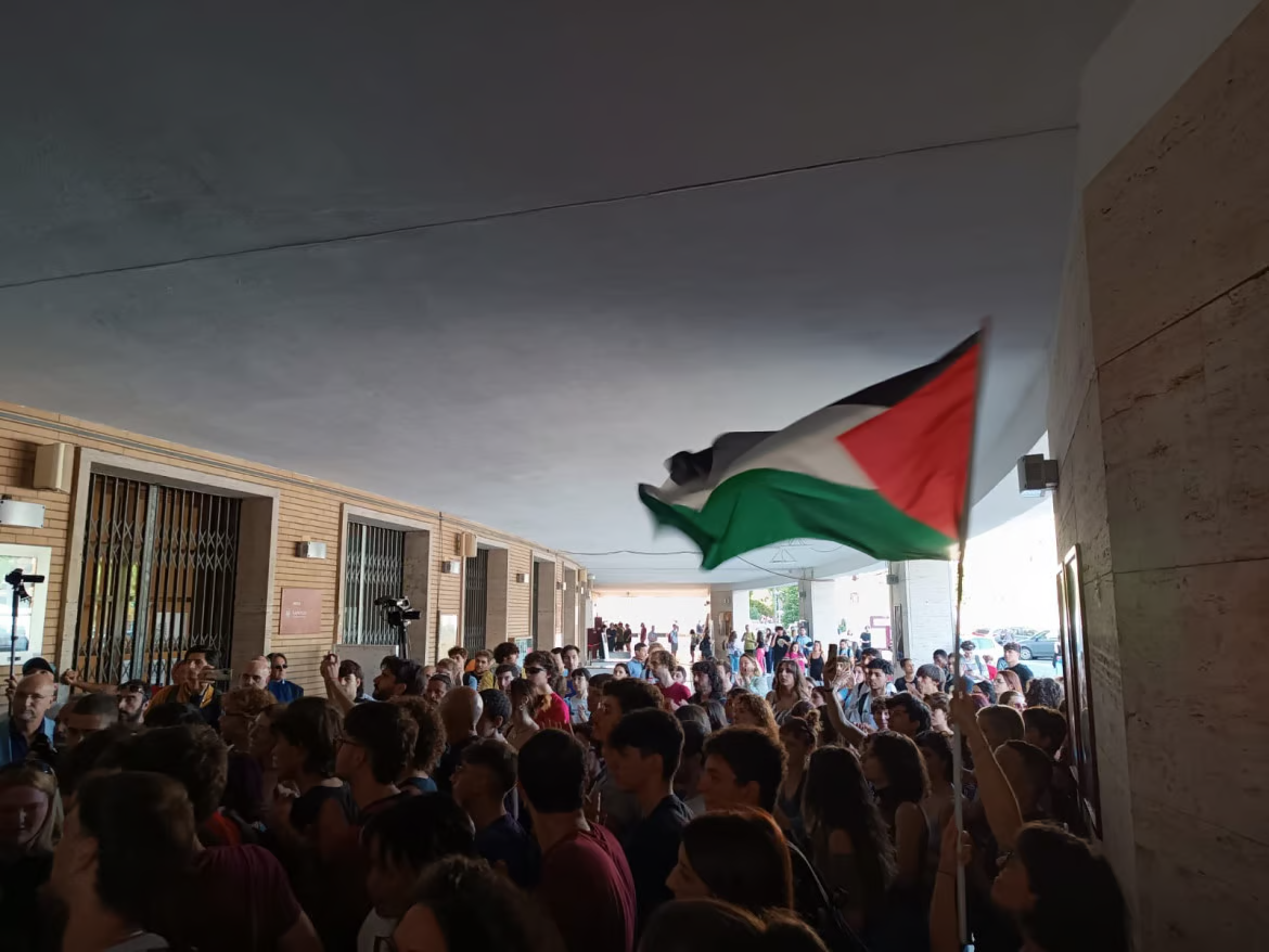 “Nessuna condanna assolve Israele, Sapienza stands with Gaza”, è lo striscione comparso martedi mattina all’università La Sapienza di Roma. “Abbiamo saputo lunedì sera tramite una mail istituzionale che oggi si sarebbe riunito il Senato Accademico per fare una mozione di condanna del brutale attacco contro Israele. Noi come studenti e studentesse abbiamo pensato che fosse assurdo che la Sapienza prendesse una posizione del genere mentre venivano bombardate tre università di Gaza, e tutta la striscia”, racconta Federico del collettivo Zauma, uno dei collettivi universitari che hanno aderito alla mobilitazione di ieri mattina.