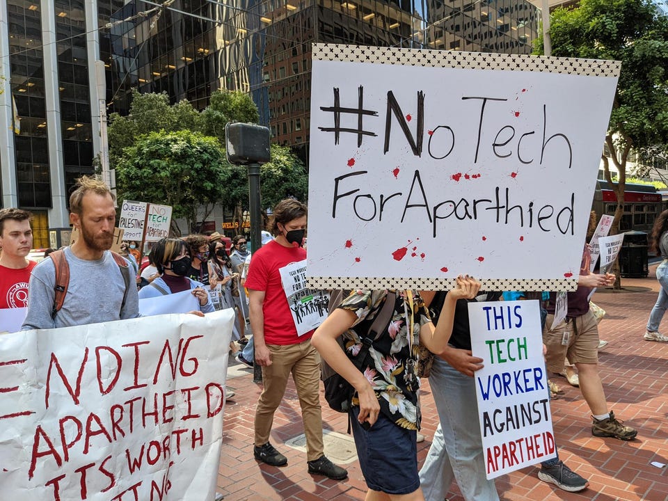 L’8 SETTEMBRE SCORSO la mobilitazione si è spostata dall’etere alla piazza. Dopo una petizione firmata da oltre 700 googler, 400 dipendenti di Amazon e 250mila persone, centinaia di lavoratrici e lavoratori hanno manifestato davanti alle sedi delle società a New York, San Francisco, Seattle e Durham, in una delle iniziative pubbliche più riuscite della coalizione No Tech for Apartheid (tra i suoi membri Jewish Voices for Peace, Bds, Mpower Change, Kairos, Icahd).