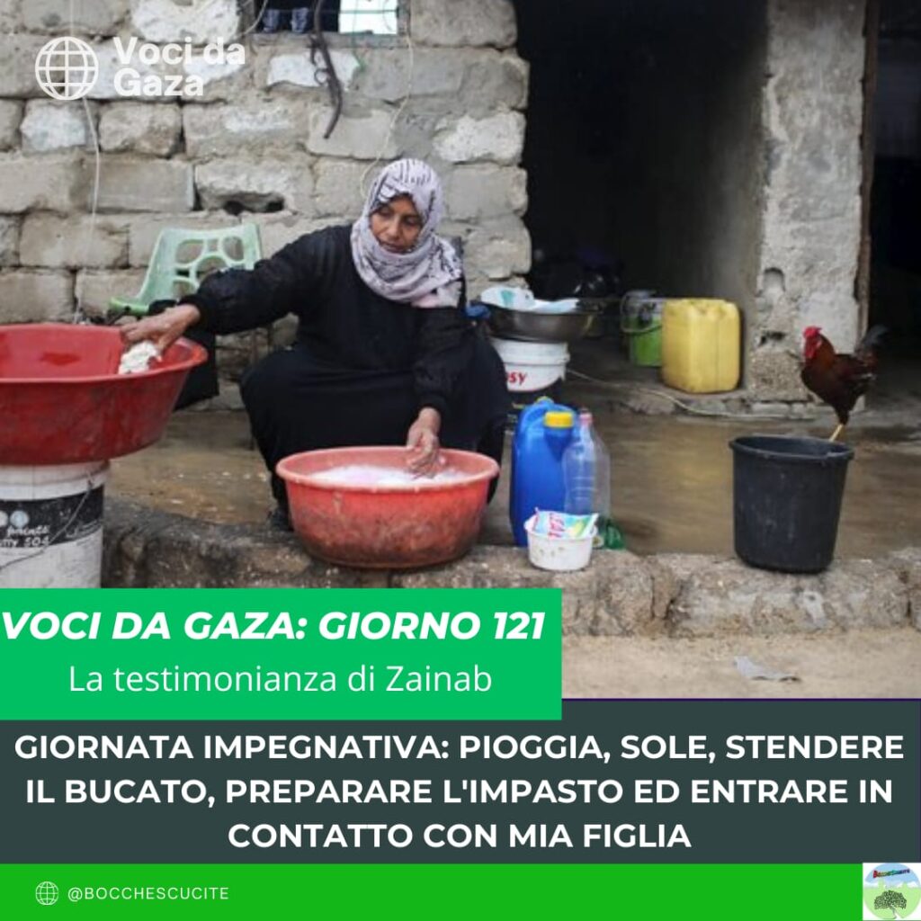 Oggi ho deciso di uscire al sole dopo che ha smesso di piovere. Da ieri sento un forte desiderio e bisogno di stare da sola con me stessa. Ho terminato una parte dei miei compiti abituali, cioè partecipare a spianare la pasta e stendere l’impasto, a me piace farlo ogni due o tre giorni, visto che a colazione mangiamo solo pane, mentre il pranzo dipende principalmente dal riso e la cena è stata cancellata dal nostro programma alimentare dall’inizio di questa maledetta aggressione, poiché cerchiamo il più possibile di garantire il consumo di generi alimentari che scarseggiano giorno dopo giorno, soprattutto quando le operazioni militari si intensificano nella città di Gaza, come sono state per una settimana ora. I venditori non osano muoversi sotto i bombardamenti e i droni quadricotteri che sparano i loro proiettili contro qualsiasi assembramento umano che vedono.